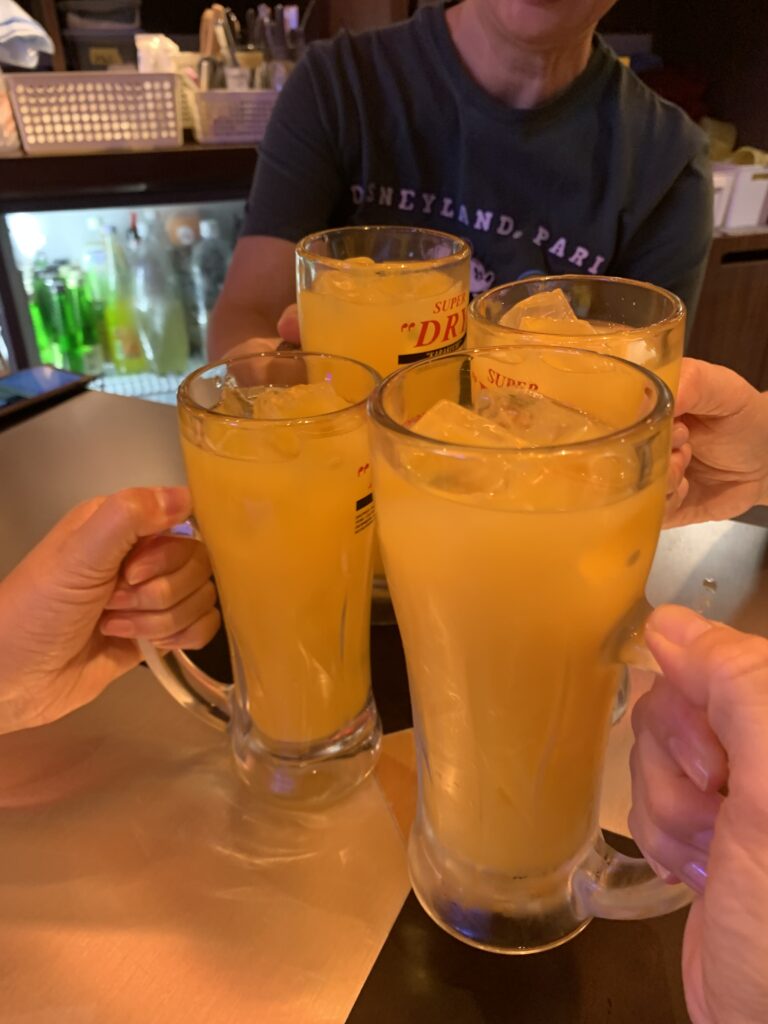 ポンジュースで乾杯。体に良い気がする飲み物。ビタミンCがたっぷり、かな?