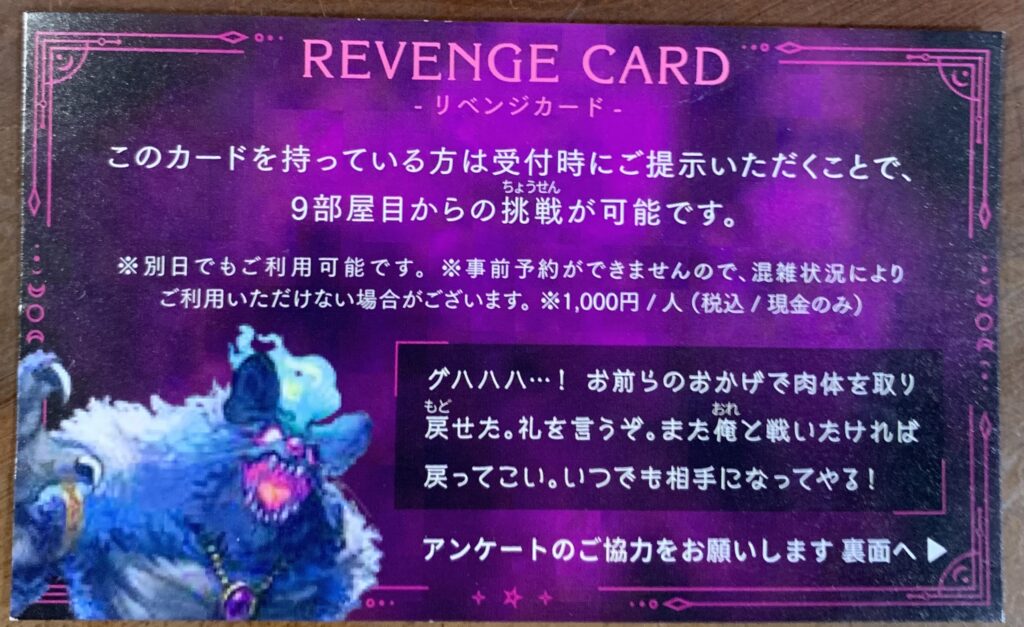 一度外に出て、タブレットと杖を返却。そして失敗のカードを渡される。そこには、一人千円払えば9番目の部屋から挑戦可能と書いてある。