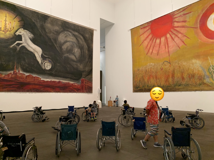 最初、車いすの団体さんがいるのかと思ったのだが、気が付いたら誰も座っていない空の車いすがたくさんあった。おや?もしやこれも作品か?