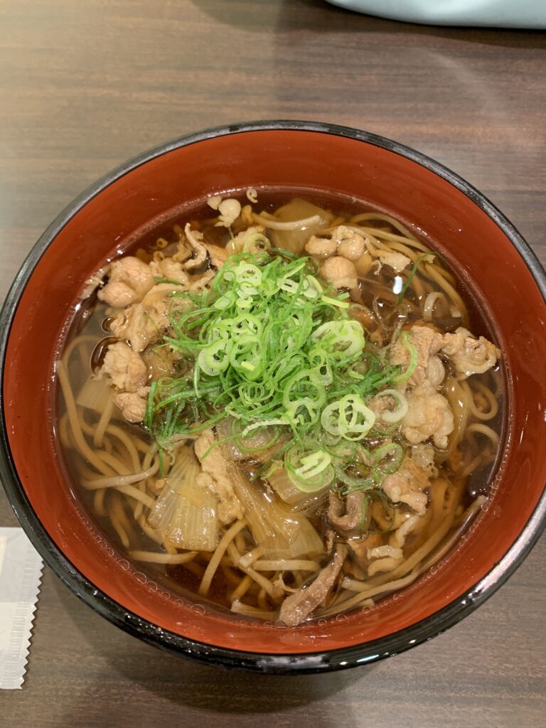 肉そば。長ネギも乗っているのに、タマネギも入っている。これは牛丼の具だね。牛丼も売っていたから、これはかけそばに牛丼の具を乗せただけだね。美味しいけれど。七味をかけた(下の写真)