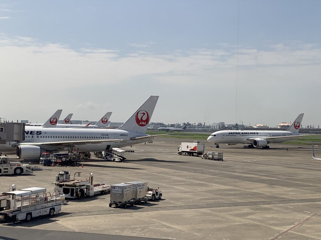 時間まで、窓際の椅子で待機。おぉ、JALが並んでいるのを見るのは珍しい。