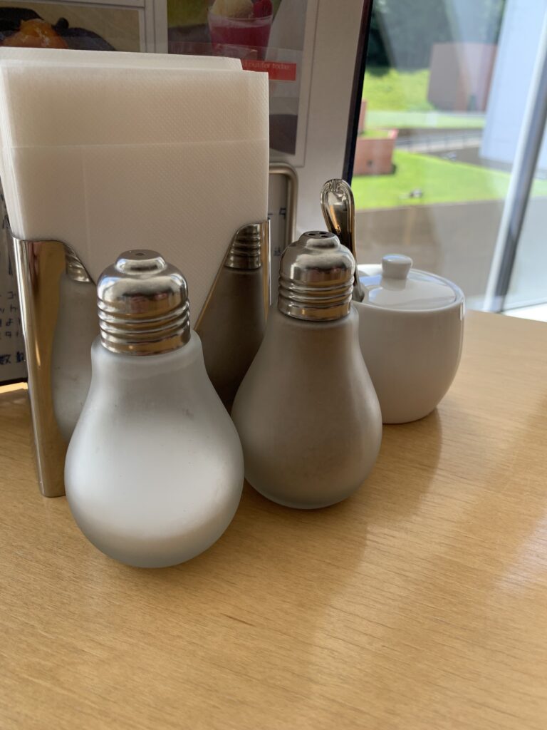 塩・コショウが、電球じゃん!可愛い。ガラスの器で、質感も電球そのもの。これ欲しい。売ってたら買ったな。