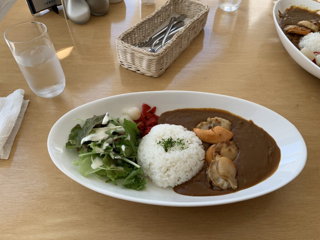 美味しかったけど、ホタテ味というかシーフード味のカレーではなく、ビーフカレーかポークカレーにホタテを乗せたような味。そして、貝ひもが噛み切れない……。夫が、