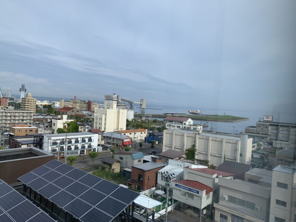 二日目の朝、カーテンを開けて窓の外を見てみると、右の方に海が見えた。