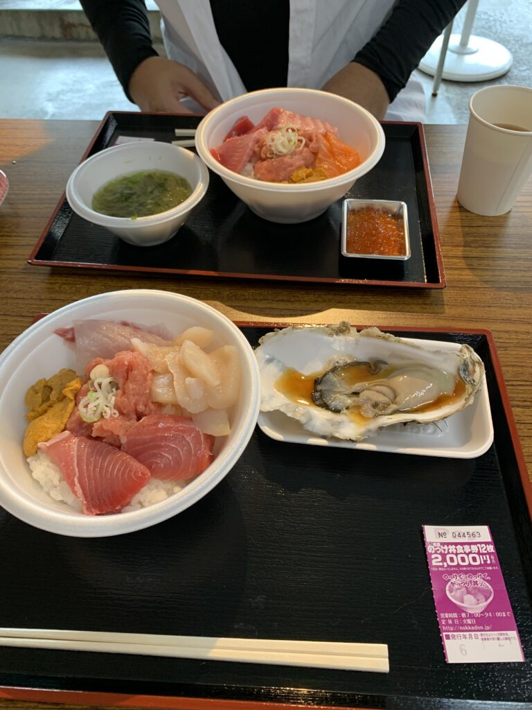 チケット1枚で交換できるものと、2枚で交換できるものとあった。ネギトロ、ホタテ、カキ、マグロなどなど、これが欲しいと言ってチケットを渡すと、お店のお姉さんが私のどんぶりご飯の上にきれいに乗せてくれる。カキは乗せずに殻付きでそのままだったが。ぐるりと敷地内を回って行くと、テーブルと椅子が置いてあるところに出てきた。なるほど、ここで食べられるのか。分りやすいぞ。