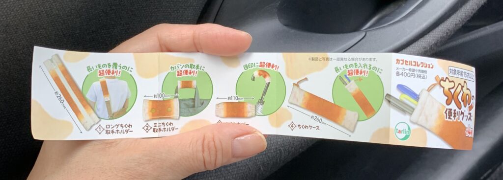 休憩所の建物の中にガチャガチャの機械が並んでいた。ほとんどが子供用の訳の分からないおもちゃだったが、一つだけ大人心をくすぐるものが。それはちくわ。夫が400円を入れて回すと、何か出た。え、ナニコレ?ペンケースだって?長すぎない?