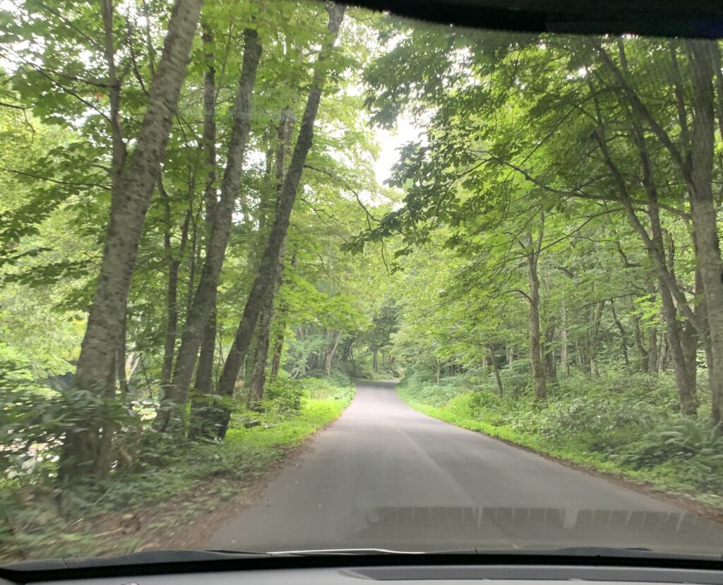 ダーツバーで入手した情報により、十和田湖へ行くには2本のルートがあって、ほぼまっすぐ行く山道と、東の十和田市を通るなだらかな道。行きは山道で行くということだった。カーナビに目的地を設定し、いざ出発。到着予定時刻は2時間後の11時頃と出た。