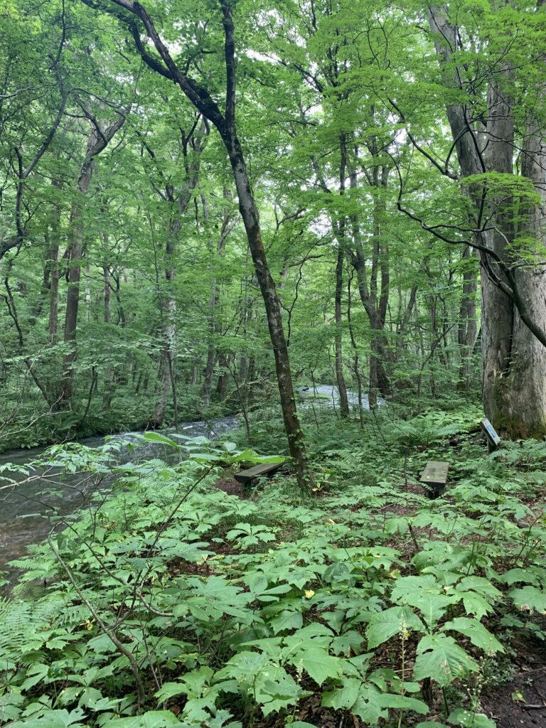 さあ、これから奥入瀬渓流を歩く。十和田湖から流れ出る渓流。その為に長そで長ズボン、帽子で来たし、山の天気は変わりやすいということでレインコートも持ってきた。幸い雨は降りそうもない。ただ、湿度が高くて汗が出る。