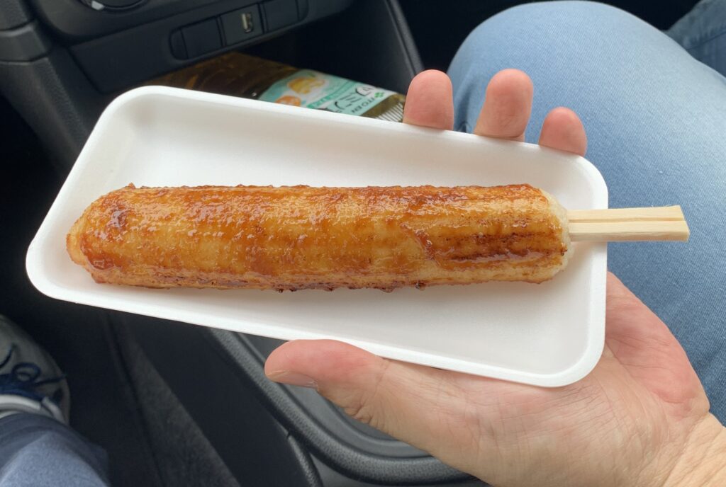 お土産を買い込み、店先できりたんぽを一本注文した。おじさんが温めてくれている間、夫は先に車に戻った。