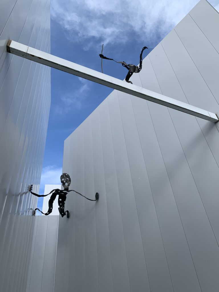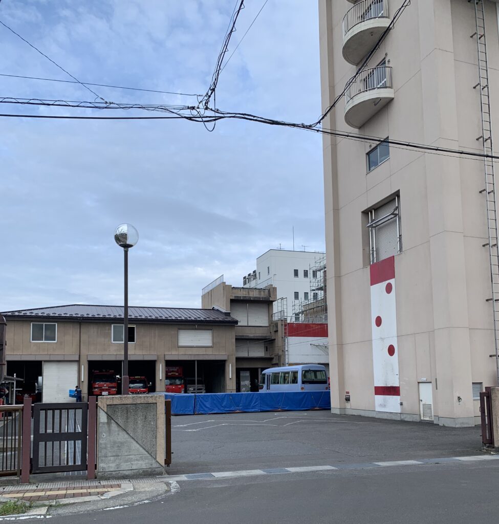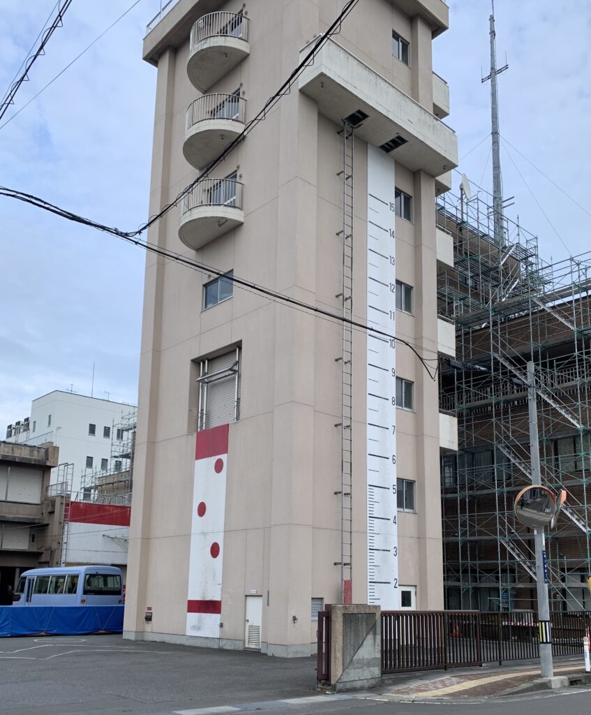 と、思ったが、よく見たらそこは消防署。これはアートではなく、訓練用のはしごのめもりだった。