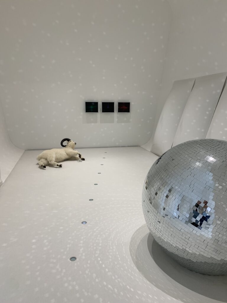 「デッド・スノー・ワールド・システム」(ボッレ・セートレ)。靴を脱いで上がったが、結局2~3歩進んだだけでそれ以上は入れないと言う。なぜ靴を脱がせた?まあそれはそうと、電子音が鳴り、光があちこちに。SF映画「2001年宇宙の旅」から着想を得た作品だとか。
