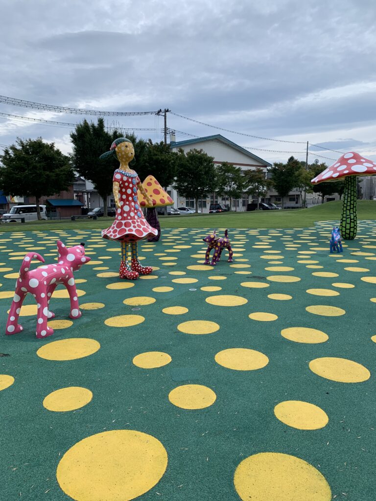 まずはこの目立つ水玉。皆さんご存じの草間彌生氏の作品「愛はとこしえ十和田でうたう」である。