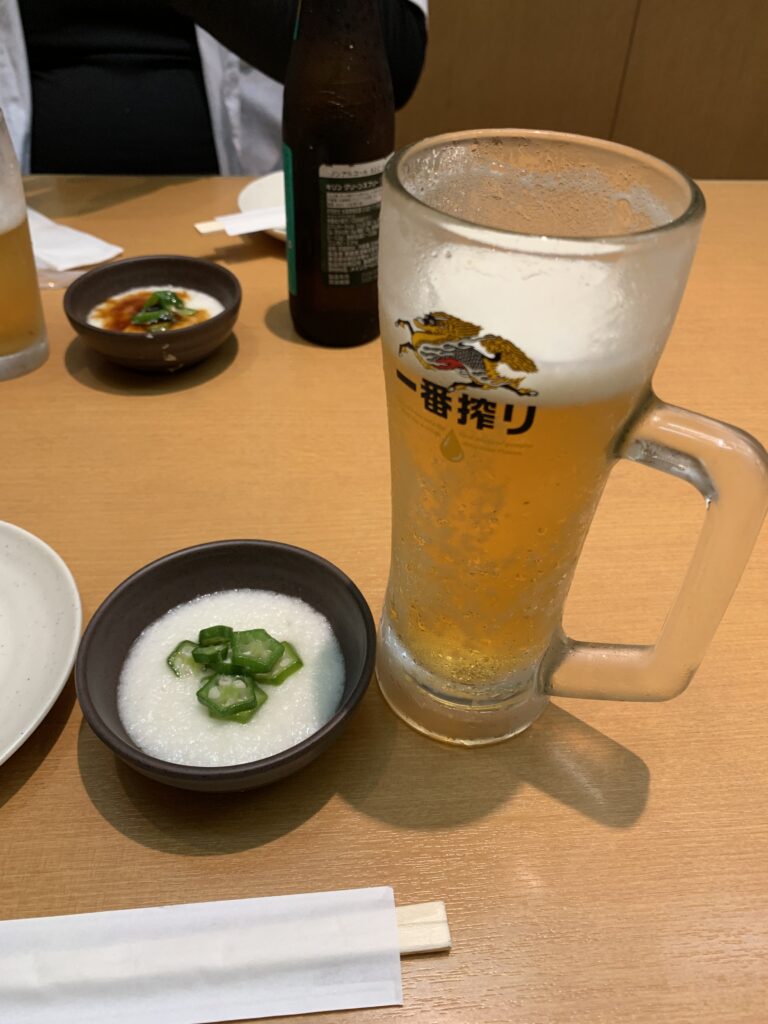 ま、とりあえず乾杯。私は飲まないつもりだったが、夫は運転があるからノンアルだし、ここは居酒屋だし、一杯飲みな、と夫に言われて。やっぱりビールは上手い。今日はけっこう汗かいたしね。