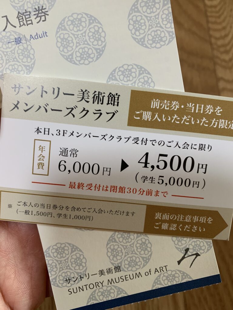 例によって何で支払うか考えていたら、ここにない物でも対応できますと言うので、paypayは?と聞いたら大丈夫だと言う。それで支払ってチケットを受け取り、一緒にサントリー美術館メンバーズクラブの割引券をもらった。なんだこれ?