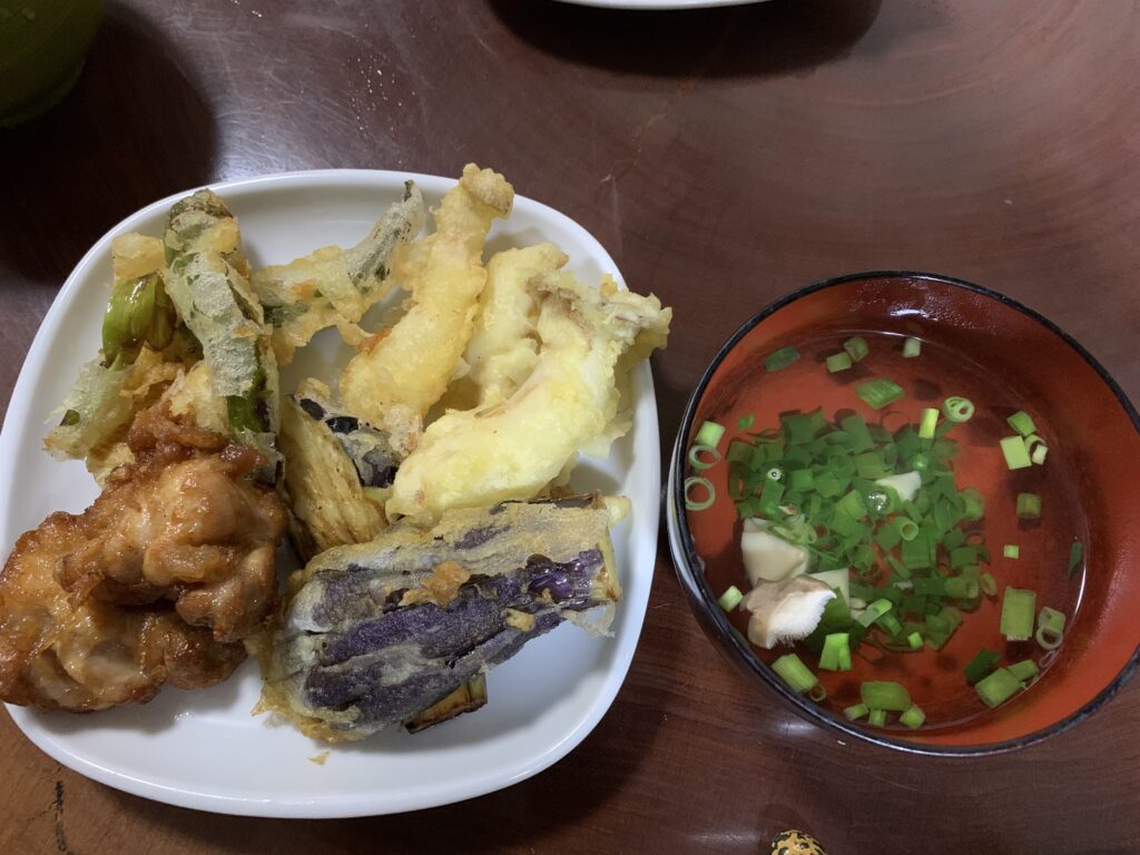 ネギの天ぷらが旨い!サクサクだ。エリンギも美味しいが、長男が「マイタケほどじゃない」と言ったのは、確かにその通りかなと思った。そして、やっぱりナス!私はナスの天ぷらが大好き。塩でもつゆでも美味しい。あと、鶏肉もすごくジューシーで美味しかった。これは味が付けられていた。すごいじゃないか。