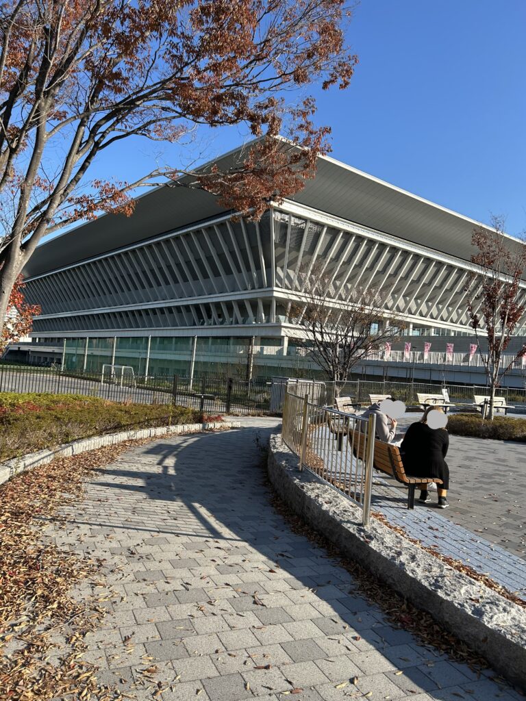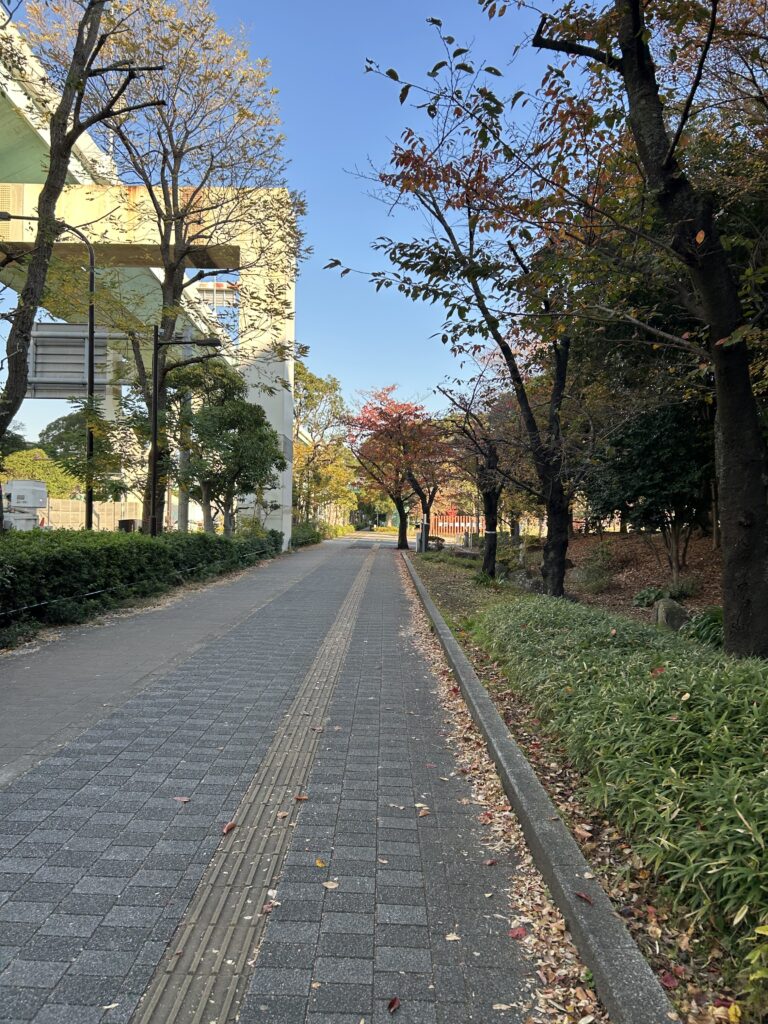 当日朝。8時頃に辰巳駅に着いた。迷わずアクアティクスセンターへ。東京もいい感じに紅葉が。