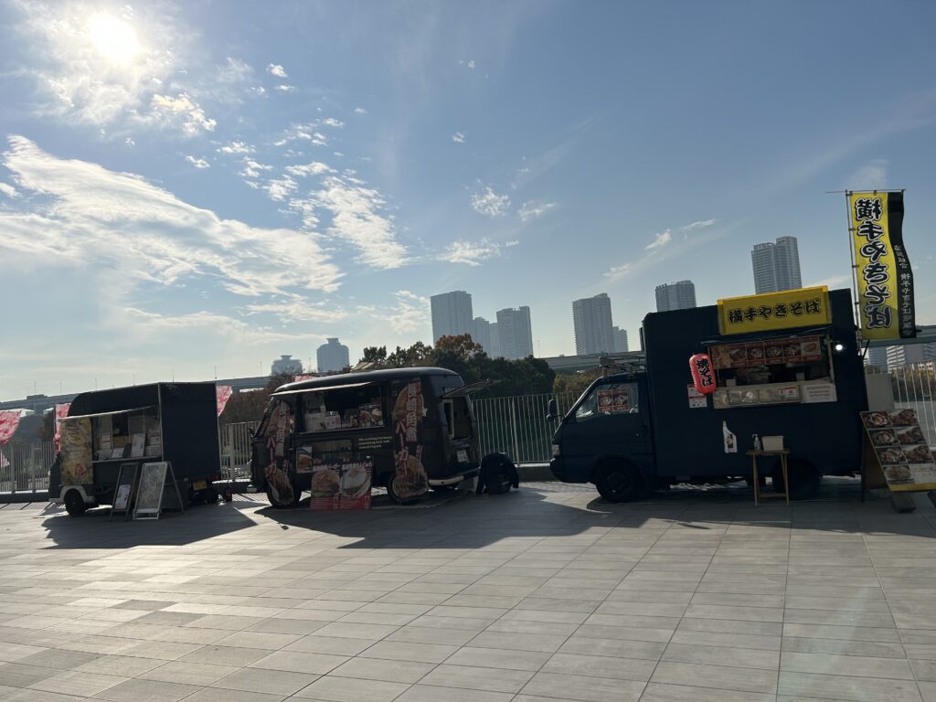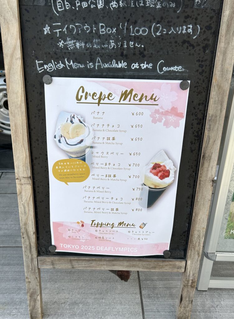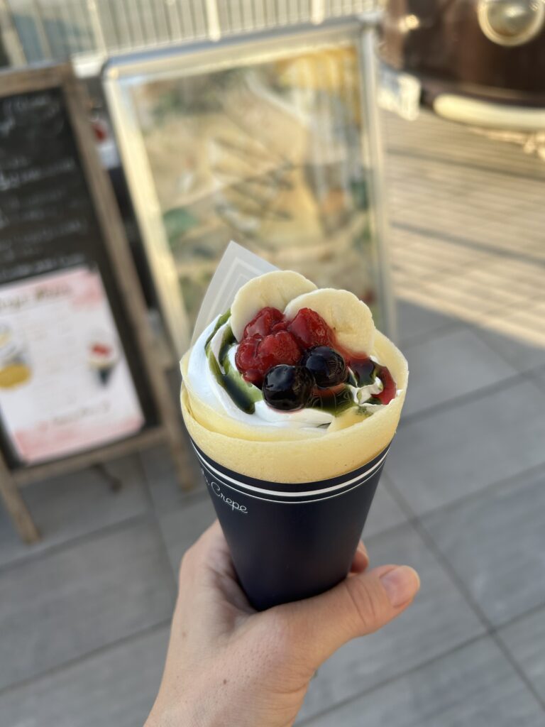 外は良い天気。上着なしでもちょっと涼しいくらい。キッチンカーが3つあって、そのうちの1つがクレープだった。米粉のもちもちクレープだって。これを後で食べようという事になった。メニューの写真を撮っておいて、どれにするか選んでおこう。しかし、クレープ食べるならチョコとか飴とかを食べるべきではなかったな。
