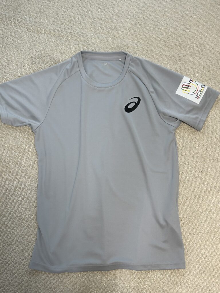 帰宅してから、もらったグレーのTシャツを開けてみた。袋に入っている時はアシックスのマークしか見えなかったが、なんと肩の所にデフリンピックのマークが!
