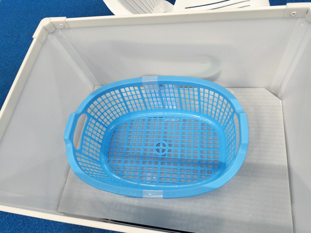 カゴが白い箱に入っているので、新しいカゴを持って入場して行く。8レーンあるから8人が連なって入場して行くのだが、姿勢よく歩き、しかもマットとマットの間の線に沿って歩く。自分のレーンの前に着いたらつま先をマットの継ぎ目の線に合わせて立ち、スタートのピストルが鳴ったら前へ出て、カゴを交換して元の線のところに戻る。もし選手の荷物がカゴの外に出ていたらそれもカゴに入れて回収。全員が揃ったら合図があるので戻って行くと。箱↓(カゴと箱の画像、お借りしました)