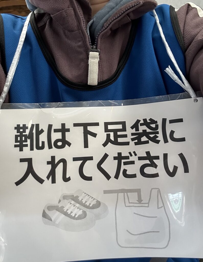 スタッフさん1人と我々が正面入り口へと向かった。立て看板は土足エリアにあった。スタッフさんが受付の女性に手話でスリッパを貸して欲しいと伝えて、2足しかないと言って出してくれたスリッパというかサンダルに、お2人が履き替えて取りに行ってくれた。が、そこで受付の女性が言った。