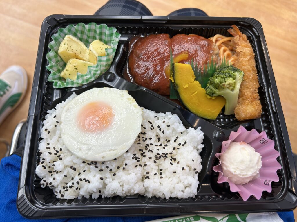 私がこの間、明治座で食べた鮭弁当は、ご飯が固くて喉を通りにくかったが、このお弁当はご飯が柔らかくてしっとりしていた。食べやすかったのだが、OさんとMTさんの、ご飯の水分が少し足りないという会話が耳に入り、柔らかいとは言えなかった。そうだ、この間鮭弁当を食べたのだから、今日はハンバーグで良かった。ただ、想像していた味とは違った。思いのほかエビフライが美味しくて、サイズが小さい事が残念であった。それにしても炭水化物が多くて、野菜が足りない。ちょっとしょっぱい。目玉焼きはビニールを被っているかのような食感。仕方ないよね。お弁当に入っている目玉焼きはこういう物だよ。
