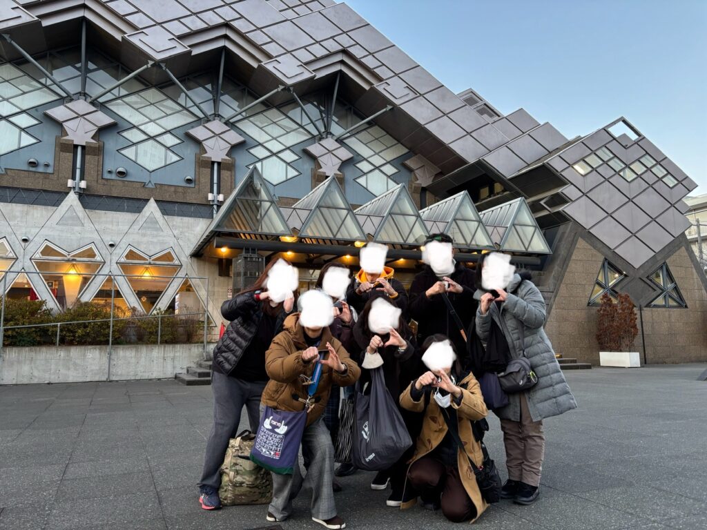 中に入るとすごく暖かくて、ダウンコートを脱いだ。1階のアリーナに連れて行かれて、ここに荷物を置くようにと言われた。何となく、横の舞台の上にみんなが置いたら、通訳さんを通して、舞台は使うから端っこの壁際に置くようにと言われて置き直した。なぜ初めに舞台の上に置いたのかな。自分がなぜ置いたのか、今になると分からない。置きやすかっただけだろうか。