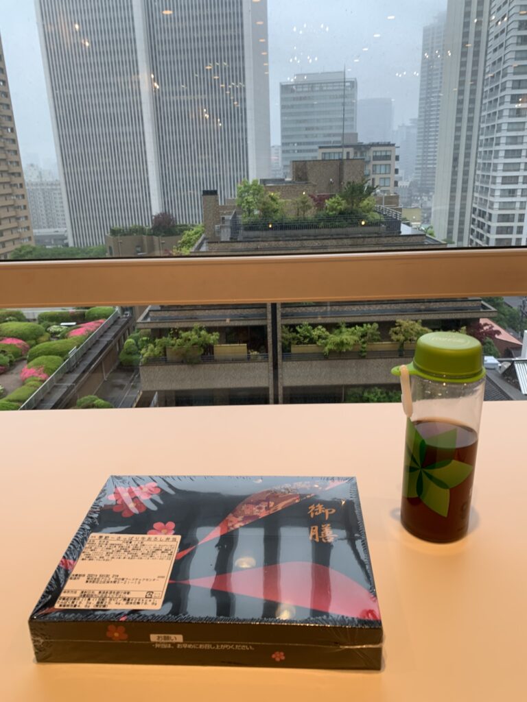 1時27分くらいにビルに着いて、エレベーターで12階に上る。受付でお弁当引換券いろはすを受け取って、控え室へ。