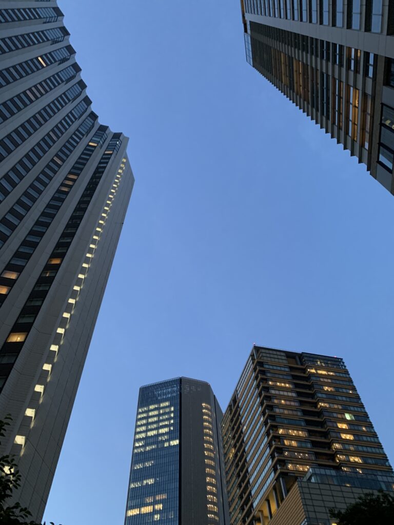 あまりにも都会な場所では恥ずかしいので、ちょっと都会の外れに行ってから上を向いて写真をパチリ。高いビルがたくさんあるものだ。都心だもんなあ。アメリカ人と思われる父娘とすれ違う。手をつなぎ、娘が一生懸命に何かを話していた。ああ、桜坂。