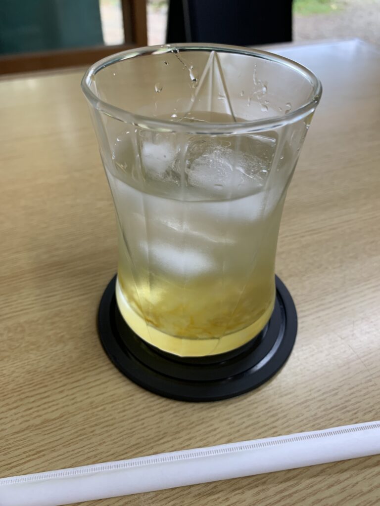 ジャーン!柚子ジュース。甘い。冷たい、美味しい。一気に飲みたいのを我慢。底に柚子ジャムが沈んでいるので、かき混ぜながら飲む。たまにストローに柚子が詰まる。ずずっと吸うと食べられる。旨い。