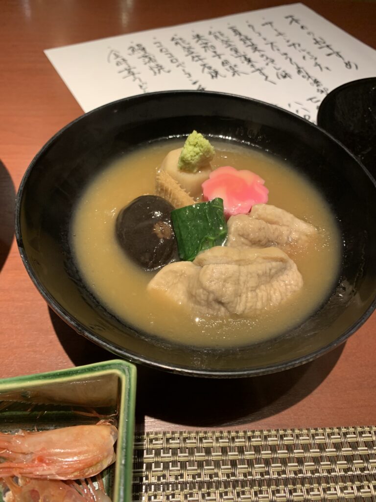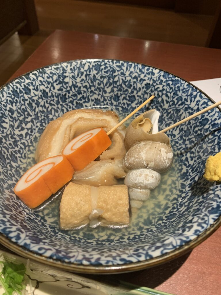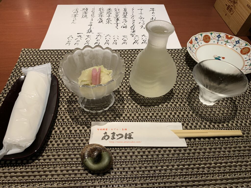 加賀鳶の極寒純米酒に、お刺身、治部煮、おでん。おでんは全て関東では食べないような珍しい種。