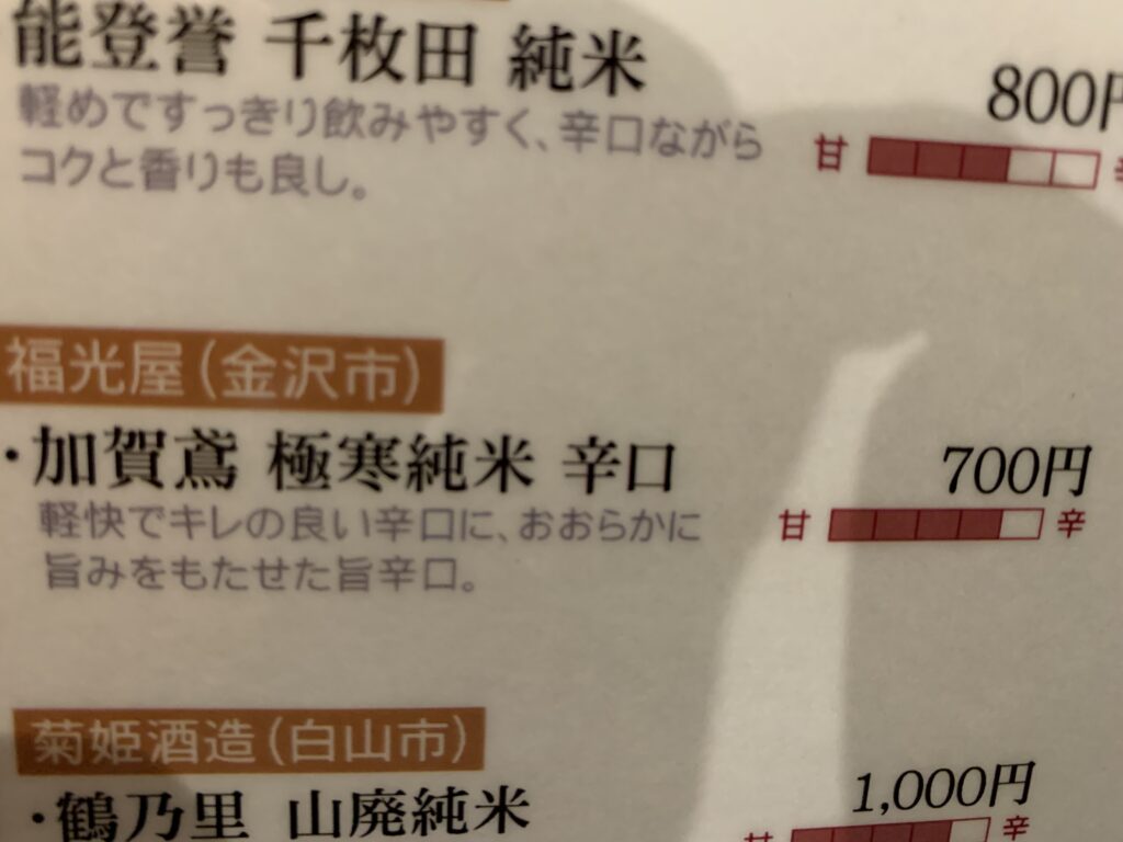 靴を脱いで上がった。新しい綺麗なお店。店員さんに金沢らしい、オススメのお料理やお酒を教えてもらい、注文した。これも当初の予定通りである。