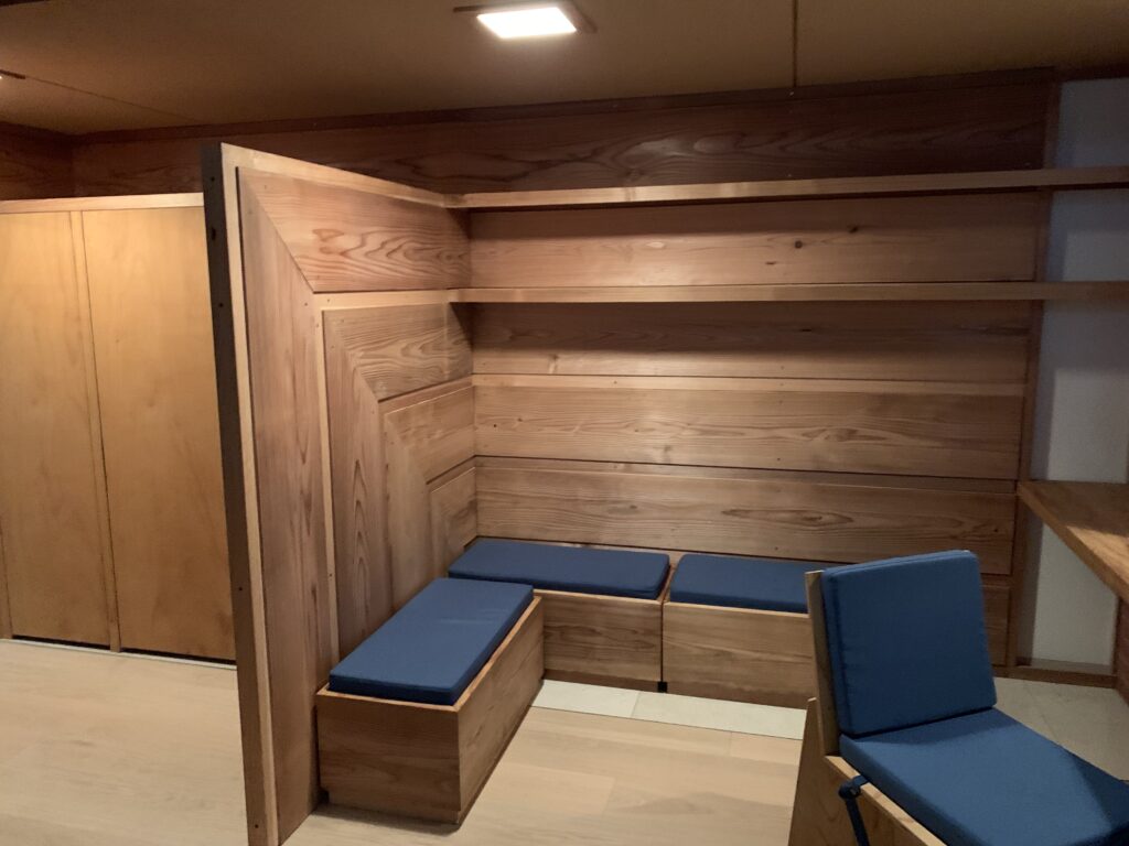また、面白い家具の設計も。例えば、掃除が楽なように便器を壁掛けにしたり、オフィスの椅子も机にくっついていて、足がないものとか。確かに掃除は楽だが、壊れた時に危ない気がしてしまうのは私だけか?