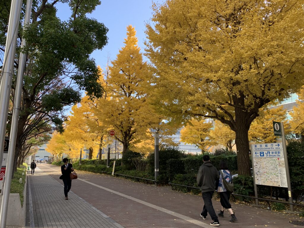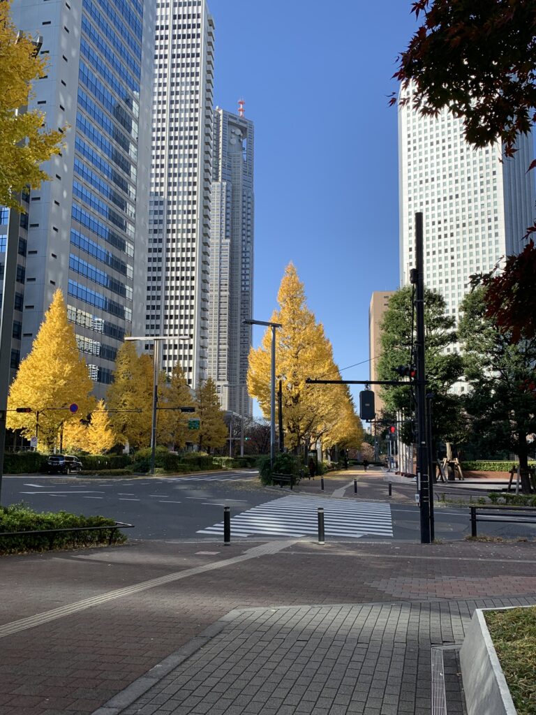 都心は紅葉真っ盛り。ここはイチョウ並木が素晴らしい。で、信号を渡るとSOMPO美術館があるはずなのだ。あっちかな?でも、それらしい建物がない。美術館のサイトを開いて建物の写真を見るが、上まで載ってない。でもそれ、ここにはない気がする。