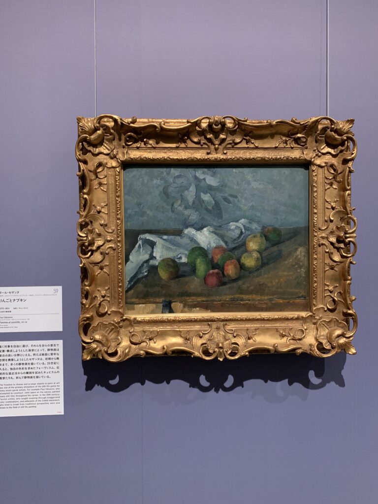 ↑ポール・セザンヌ「りんごとナプキン」。黒縁っぽい感じがセザンヌらしい。ちなみに黒縁線が西欧絵画で描かれるようになったのは、浮世絵の影響が大きい。