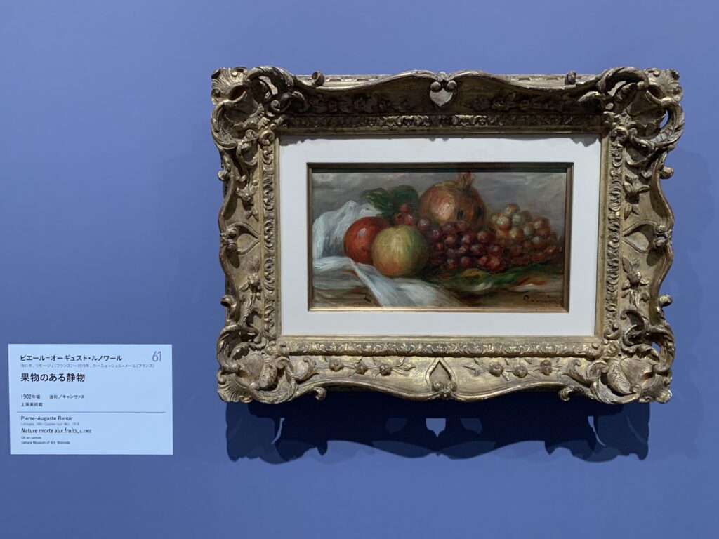 ↑そしてこちらがピエール=オーギュスト・ルノワール「果物のある静物」。この絵はもっと白っぽく輝いて見えたのだけれど、写真に撮るとちょっと暗くなってしまった。これは周りの壁が青いせいだと思うのだ。しかし、私はルノワールの描く「白い布」が好きだ。