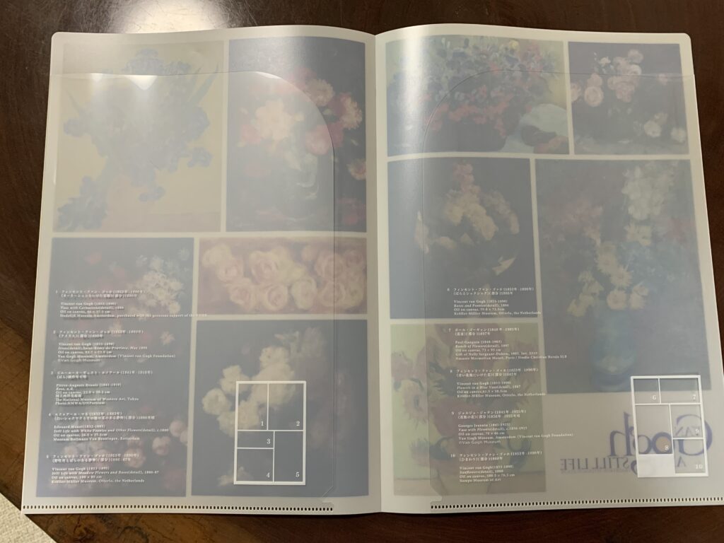 辞めよう。勿体ない。で、また何も買わないという選択をしようかと思いつつ、アイリスの絵に後ろ髪をひかれる。と、そこへ目に入ったのが両開きのクリアファイル。クリアファイルは要らないのだが、でも、ここにはアイリスもひまわりも描いてある。他にも花の絵がすばらしい。こんなにたくさん花の絵が描いてあるなんて、贅沢だ。これは買うべきではないか。660円、これなら買える。