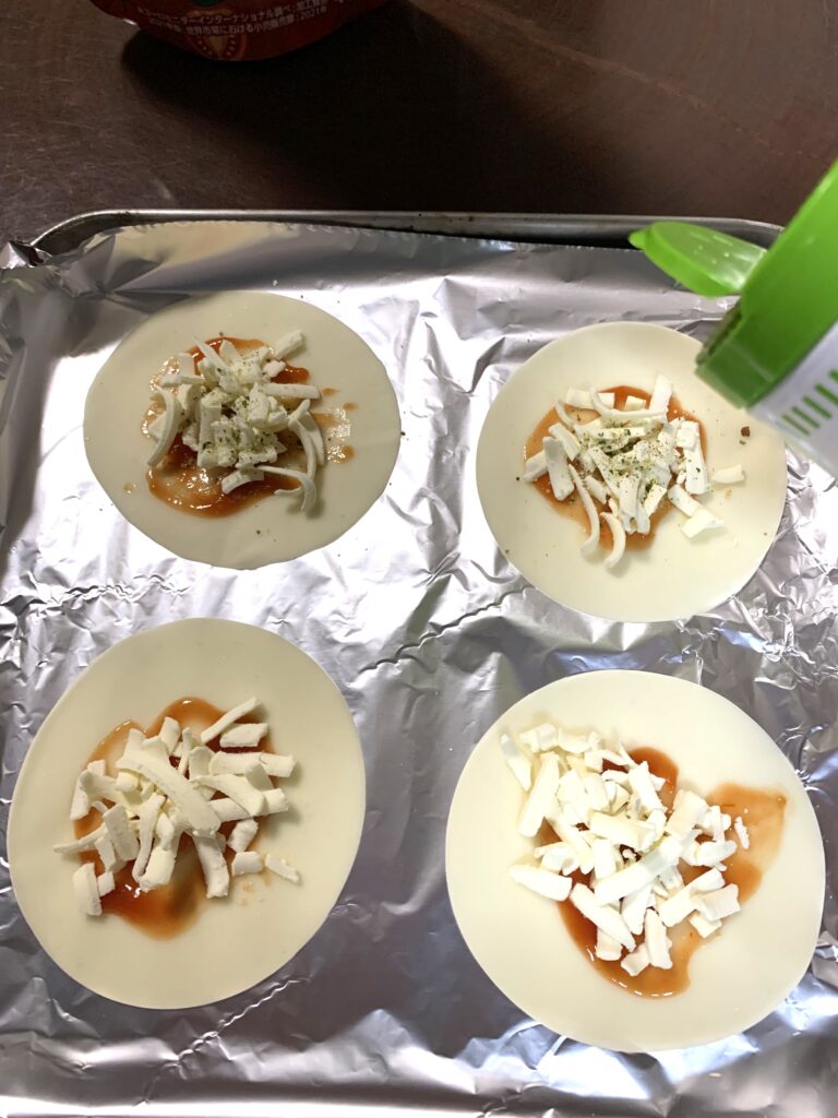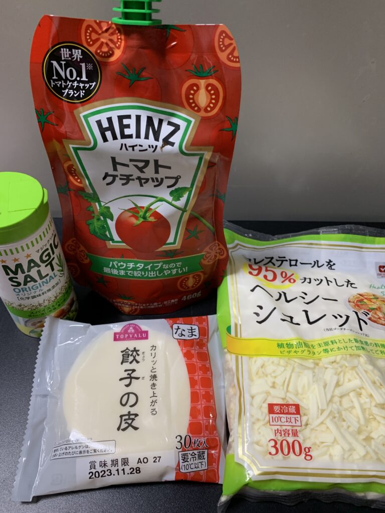 餃子の皮、シュレッドチーズ、トマトケチャップ、マジックソルトだ。