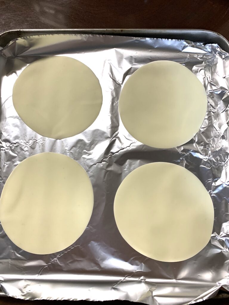 トースターの天板にアルミホイルを敷き、そこに餃子の皮を並べる。