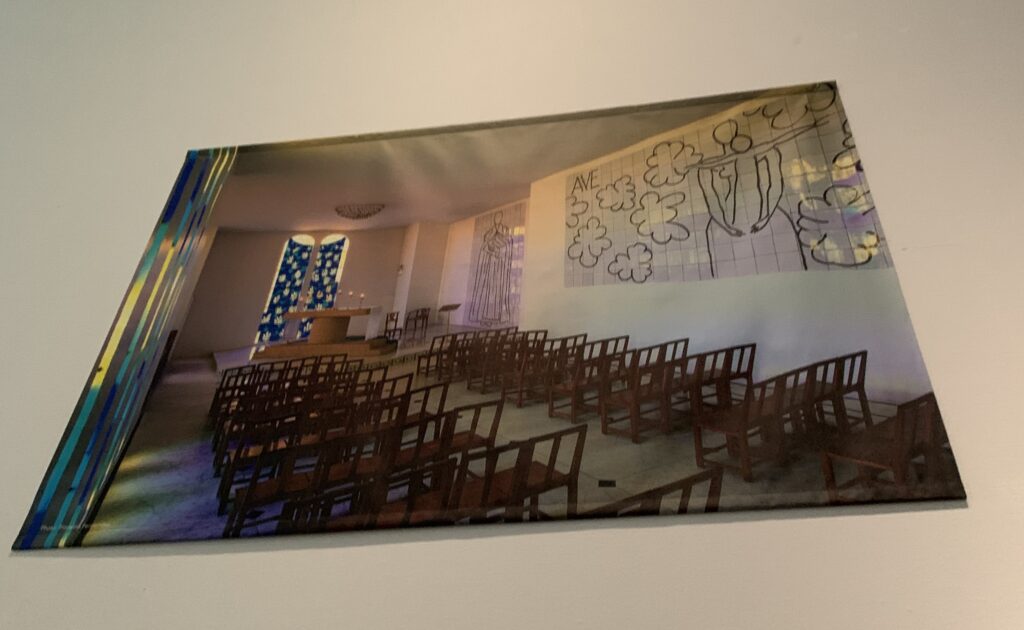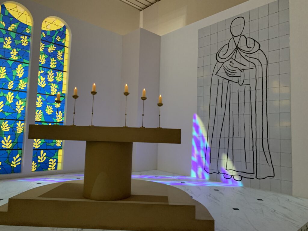 なんと、マティスは礼拝堂を丸ごとデザインしたそうだ。南仏ヴァンスにあるドミニコ会の修道女のためのロザリオ礼拝堂。その室内装飾から調度品、祭服に至るまで、デザインのほとんどを指揮したそうだ。しかし、そのデザインのモチーフは、先ほどタペストリーの話をしたが、「ポリネシア、海」というタペストリーに出てくる海藻や花などとそっくり。今しがた写真を載せた陶器の切り絵の雰囲気だ。