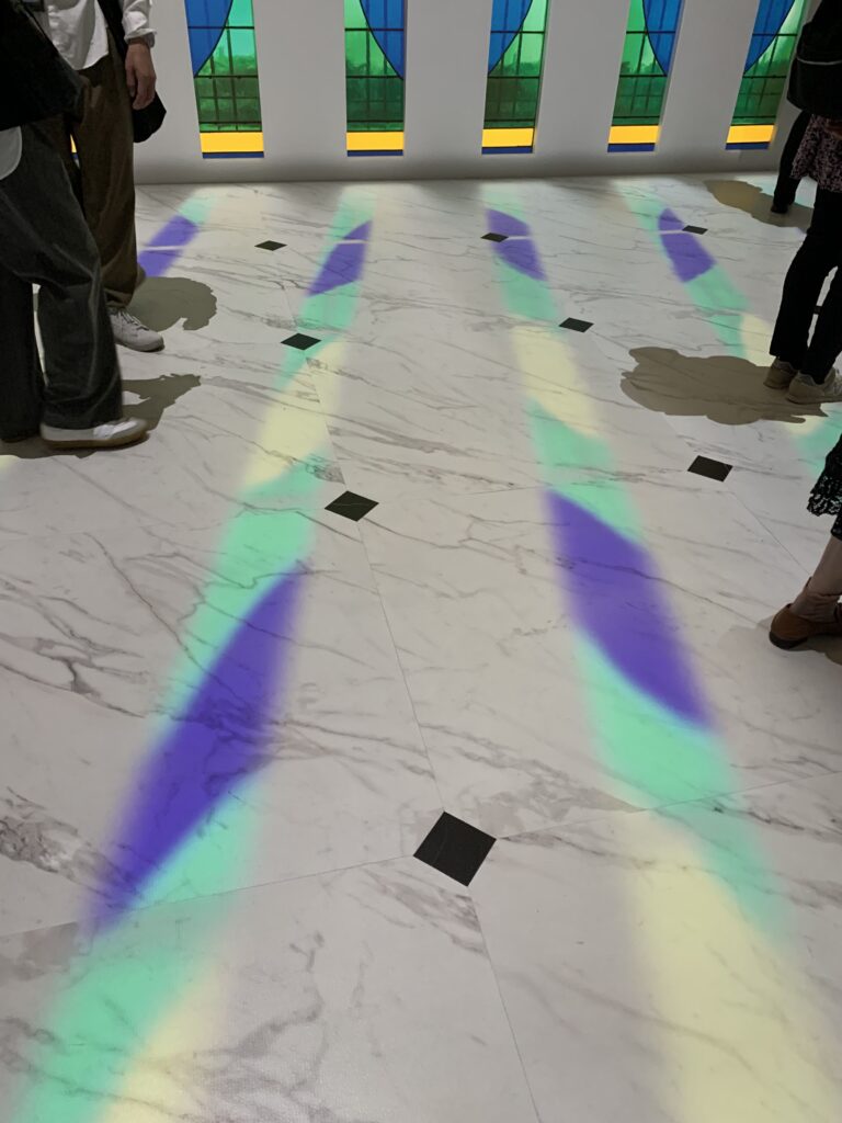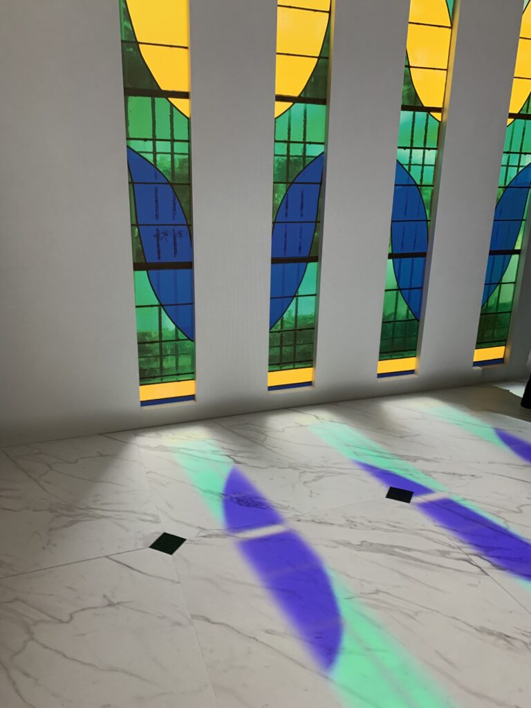 1枚目よりも2枚目の方が日が昇って来たイメージ。写真だとあまり変わらないが、実際には色が濃くなった。ステンドグラスが良く映える床。
