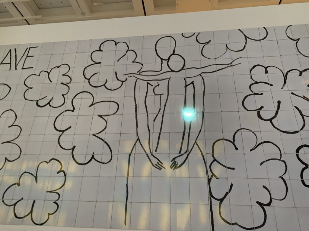 これだけでは大きさが分からないだろう。4×8メートルだそうだ。実際にアトリエにある時の写真も撮ってきた。そこには顔もあるね。この顔も可愛かった。