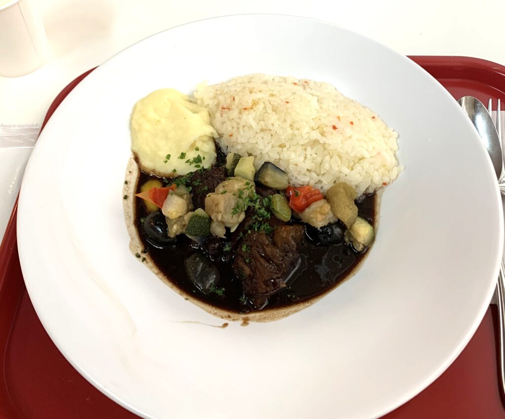 これは南仏料理なのだろうか。変わった味だった。最初に食べた時、酸っぱいと思った。この料理から酸味を感じるとは意外ではないか?だが、牛肉は柔らかく、ナスやパプリカ、オリーブなどの野菜がたくさん入っていて、全体としては塩味の少なめなビーフシチューといった感じだった。バターライスもそれほどバターがきつくない。慣れない味だが美味しかった。左上にあるのはマッシュポテト。