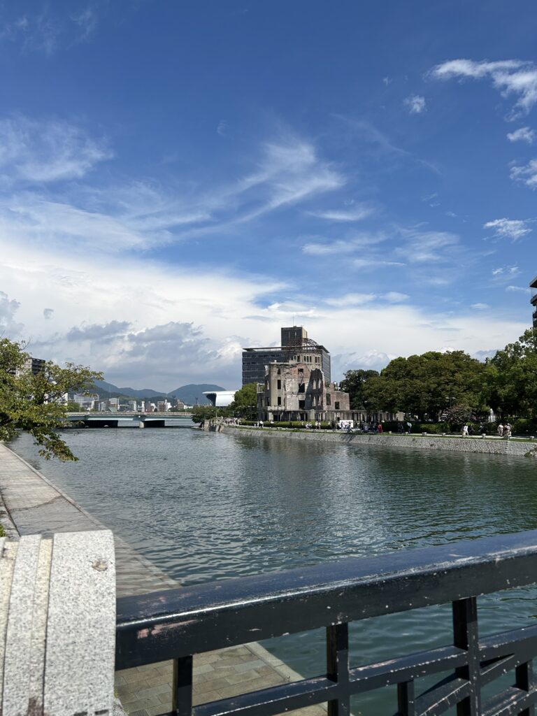 そんな事を想いながら橋を渡ると、遠くに原爆ドームが見えるので、やはり外国人カップルが自分たちを入れて写真を撮っていた。そうしたら夫が、私をそこに立たせ、写真を撮ってくれると言う。