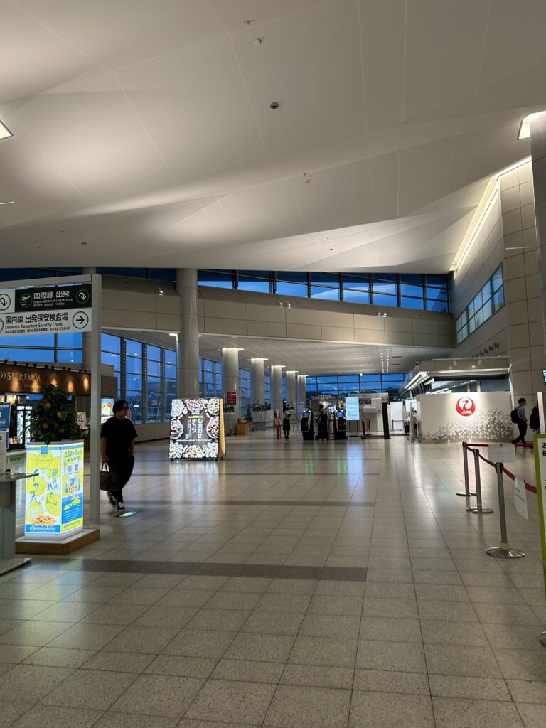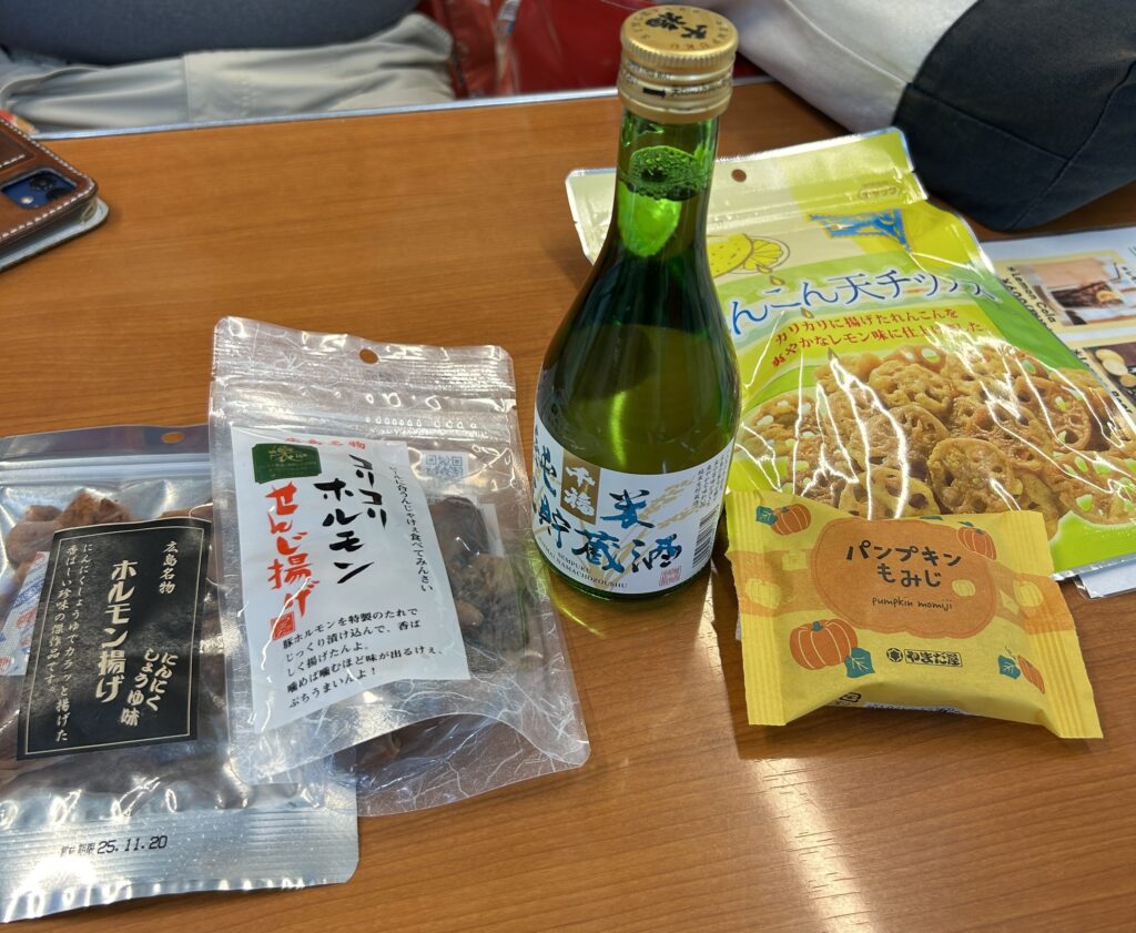 せんじ揚げは豚もつを揚げたものらしい。思ったよりもしんなりで、硬い。レンコンチップスで野菜。もみじ饅頭のパンプキン味は今は食べない。レンコンチップスは美味しかったし、長男が好きそうなので最後にまた近くのお土産屋で買って来た。あと海苔のやつも。そうして、ずいぶんお土産を買って、そろそろ保安検査所へ。あ、写真撮っておこう。