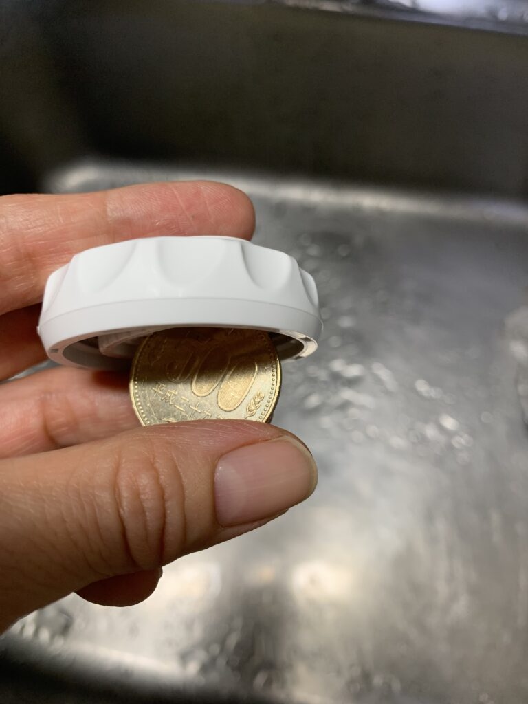 500円玉を出してきた。あったから。そして、それを使って水道の蛇口にぐりぐりとはめるわけだ。つまり、この輪っかを蛇口に取り付けるわけ。500円玉を回して締めるというわけよ。説明書には、工具などできつく締めすぎないでと書いてある。