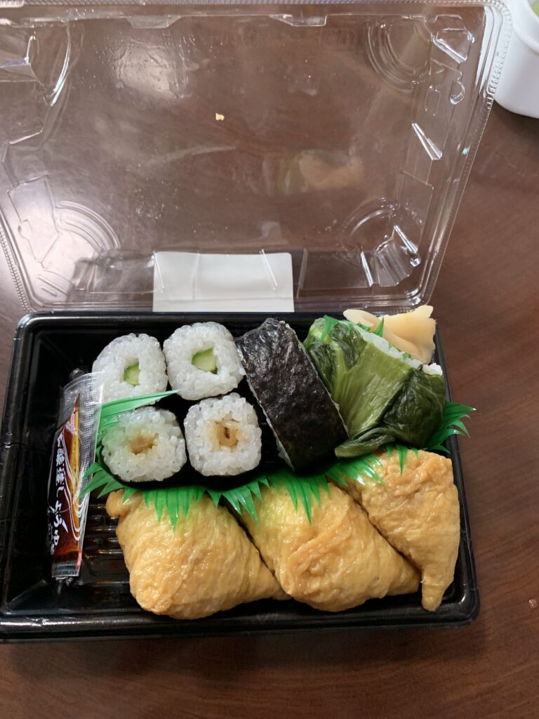 巻き寿司。ちょっと寄っちゃってるね。醤油は要らないよ。稲荷寿司が美味しかった。