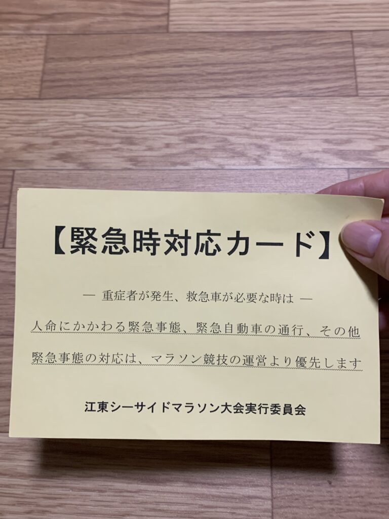 受付をして、今日の配布物をもらった。ビニール袋に一式入れて渡された。確認してくださいと言われたのでざっと見ると、お弁当、プログラム、Tシャツ、レインコート、ビブスが入っていた。そして手渡されたのが緊急時対応カードと名前シール。多分これで大丈夫だろう。寒いし、早く朝ごはんの場所に移動する事に。