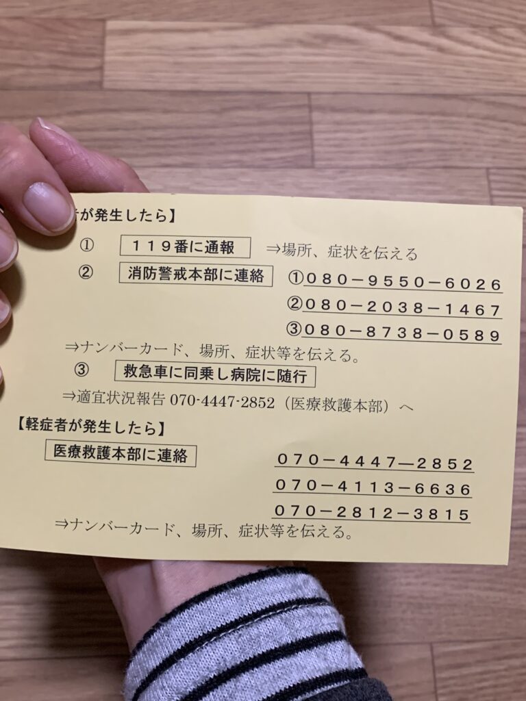 今朝、渡された緊急対応のカードだが、あれもマニュアルに書いてあった。それを当日手に持つかどうか迷ったが、これをカードにして当日渡してくれるとはありがたい。このように、地図なども自分なりに小さくして持っていれば良かったと強く思った。