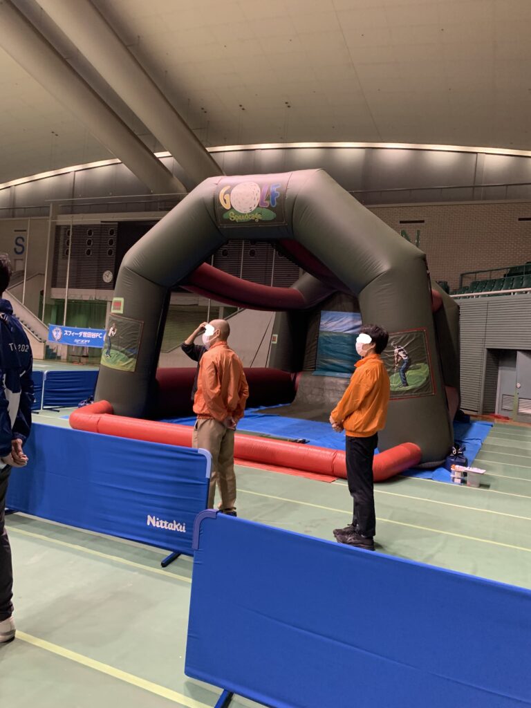 ドラゴンヒッターはでっかい風船のアトラクション。写真を見たら、幼児が中で遊ぶやつかと思ったが、実際はゴルフだった。ボールを正面の幕に向かって打ち、飛距離が計算されるというもの。本来は大人向け。計画書も渡されたが、その中には18歳以上という記載も。だが、今日は親子連れがたくさん来るイベントなので、親がいれば小さい子もOKという事になった。