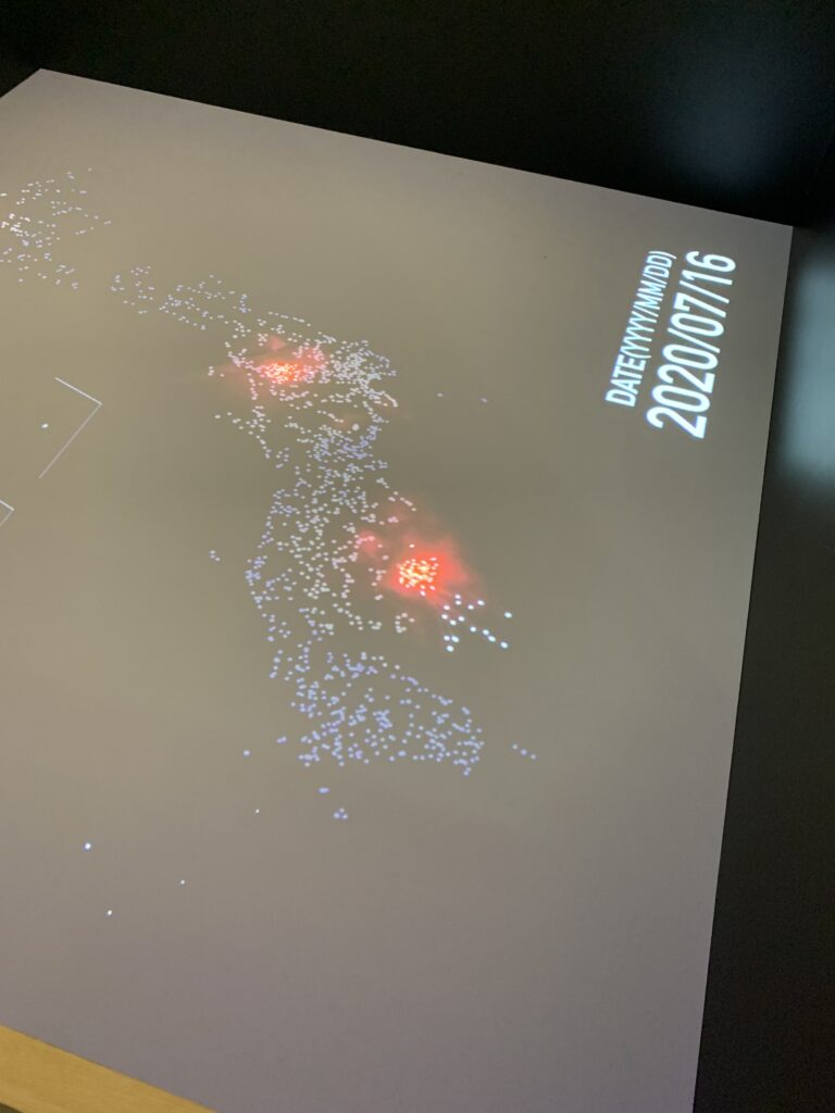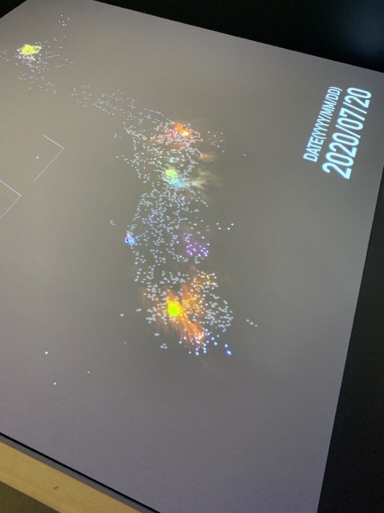 写真だと明るくなってしまうが、暗い画面だ。日付がどんどん流れる。2020年の1月1日から12月31日までの日付が流れ、時々各地で花火があがる。これはディズニーランドだね、とか色々言っていたのだが、よく読んでみると、本来開催されるはずだったけど、中止になった花火大会だそうだ。2020年と言えばコロナの始まった年。ほぼ全ての花火大会が中止になった。時々、場所を告知せずにゲリラ花火があがったという話も聞いたが、かなりの数が中止に追い込まれた。それが、ここであがっている。見えないものかぁ。